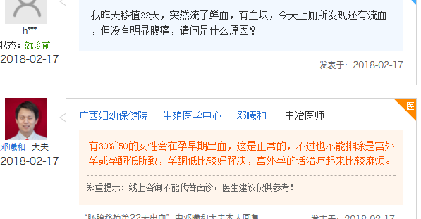 其实胚胎移植移植后发生出血状况的女性不在少数,第22天少量出血的姐妹们也并非个例,小编就受到了不少网友们的反馈,下面我们来看看她们是怎么说的。