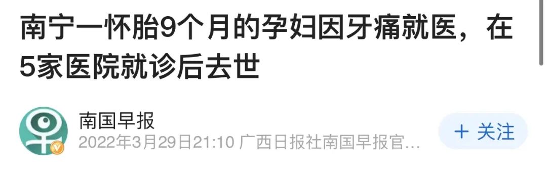 @南国早报 在2022年3月29日报道了一则新闻,广西南宁一位怀胎9个多月的妈妈,因牙痛就医,在5家医院就诊后去世。