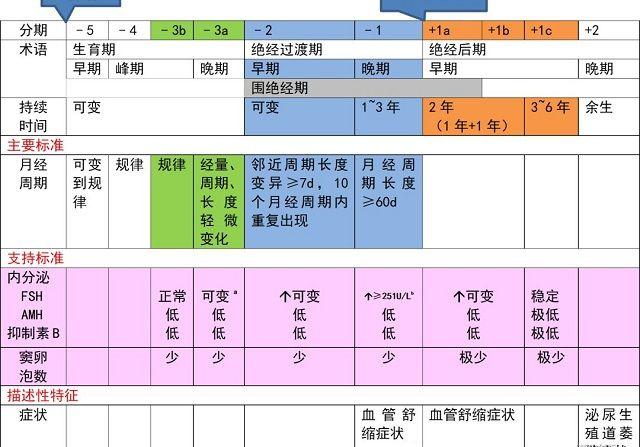 (3)生育期晚期和绝经后期早期进一步分为2~3个亚阶段,用阿拉伯数字后加英文字母(a、b、c)表示。