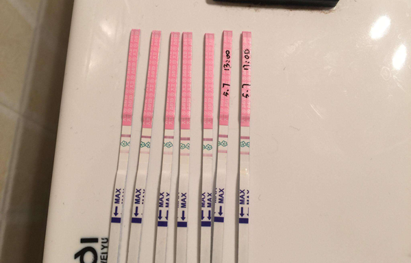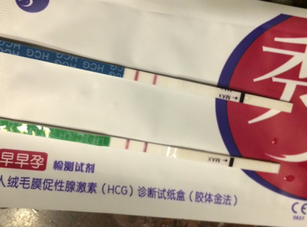 鲜胚移植第11天,终于忍不住还是测了,结果发现大白板超级伤心,但在老公的鼓励下决定等到第12天才测一下试试。我先用了绿色的排卵试纸一看有印,才马上又用了早早孕,太激动了,叫老公,可一看到老公就哭了……各种的心情呀。