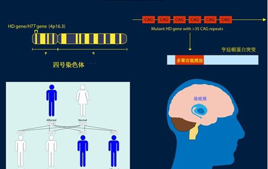 亨廷顿氏舞蹈症主要是由于位于4 号染色体上的HTT基因内CAG 三核苷酸重复序列过度扩张所致。该片段由连续重复多次的三个DNA碱基:胞嘧啶,腺嘌呤和鸟嘌呤组成。通常,CAG片段在基因内重复数目为9〜36次。