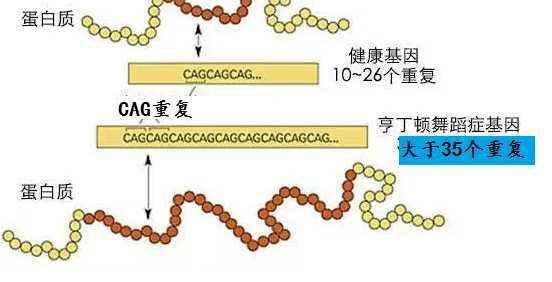 在亨廷顿舞蹈症患者中,CAG部分重复可在37-120次以上。有36〜39次CAG重复的人可能发生、也可能不会发生该病,而40次以上重复的人几乎总是会发生该疾病。