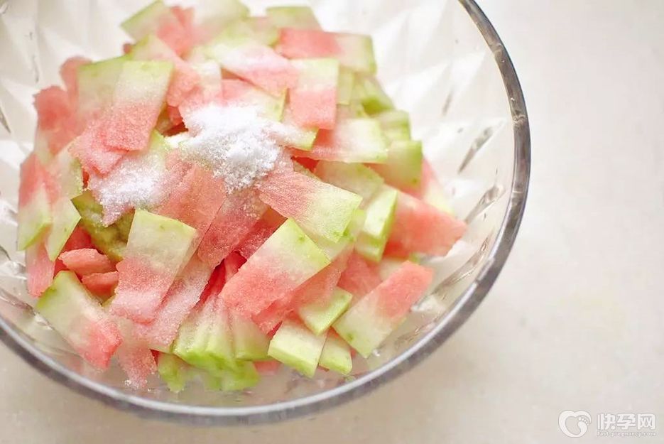 1.西瓜皮剥去外面的绿皮和里面的红瓤,然后切成丁,用少许盐腌一会儿。
