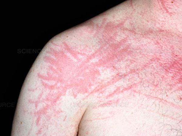 3、人工性荨麻疹:皮肤被抓伤或摩擦时出现的荨麻疹,初期症状表现为发红、瘙痒、肿胀或发炎、沿着接触线产生荨麻疹,一般会在半小时内消退。