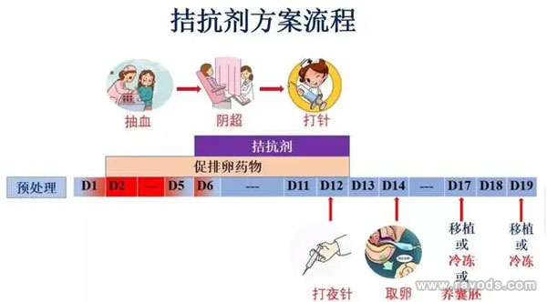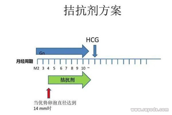 对于有些患者,卵子数已经很少, 而且本身促使卵子排出的激素很高(促黄体生成素),是的卵子在比较小的时候就因为过早出现的高激素引起卵泡排出。 为了避免这种情况的发生,我们可以采用使用抑制这种激素的一种药物拮抗剂来进行治疗,也就是拮抗剂方案。它的流程是:月经来潮第3天检测血清激素、阴道B超, 评估卵巢基础状态,条件适合时开始应用促排卵药物促排,促排期间监测阴道B超及性激素,卵泡直径增长至12mm以上时加用GnRH拮抗剂,持续应用至夜针日,待卵泡直径大于18mm时予以绒促性素扳机,夜针后36小时取卵。