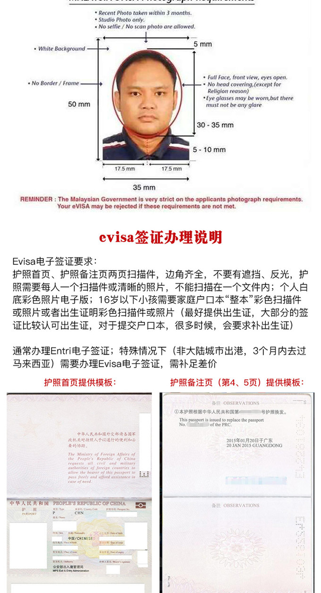entri电子签证的办理要求护照有效期至少6个月以上,需要提供最新护照尺寸的照片,确认的来回程机票和住宿证明,所有持有电子免签证(eNTRI)的旅客允许从***、香港或澳门直航马来西亚或通过新加坡,泰国和文莱入境。