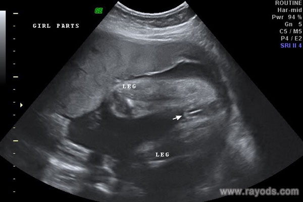 大家可以看到图中女宝的生殖器结构,上面有类似于线条的一杠,这就是女宝胎儿的外生殖器结构了,也就是我们所说的大小***,有的时候b超看到是一条线,大多时候是三条,有这一点,女宝就更好确认了。孕周大了之后,这个时候性别特征不仅很明显,而且非常清晰好分辨,看男女基本都是十有八九的事情。