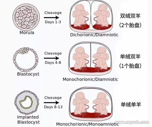 受精卵结合后,在38天内分裂,形成一个绒毛膜,两个羊膜囊腔,共用一个胎盘,简称单绒双羊,相当于两胎儿共用一间套房,有两个独立小单间,这样的双胎性别,血型,样貌等均是一模一样的。