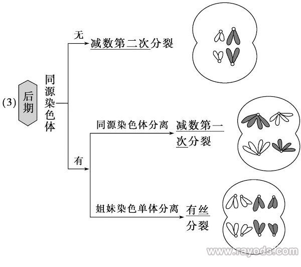 注意:减Ⅱ与减Ⅰ和有丝分裂最大的区别是减Ⅱ无同源染色体。
