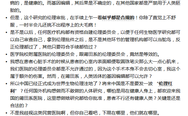 总之对本身健康的胚胎进行基因编辑,本身就没有必要,而且CCR5基因本身对免疫系统存在一定作用。同时基因编辑可能存在脱靶等问题,不能说目前很少或基本没有检测到脱靶或错误识别就是安全的,可能现有技术还无法检测到潜在风险,毫无道德底线。