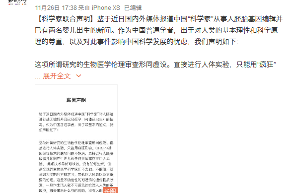 @知识分子 微博发布百余科学家联合声明,表示这项所谓研究的生物医学伦理审查形同虚设。直接进行人体实验,只能用疯狂形容。作为生物医学科研工作者,坚决反对!强烈谴责!