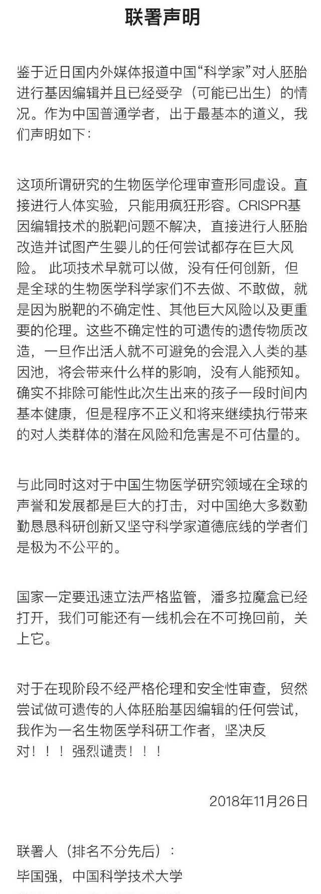 随着事件的持续走热,昨日已经有上百位科学家发表联署声明,抵制贺建奎这种严重违反科学伦理的行为。