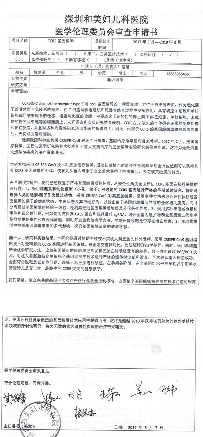 深圳和美医院关于“基因编辑婴儿”伦理审查文件