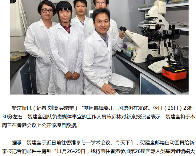 贺建奎将于本周三在香港会议上公开该项目数据