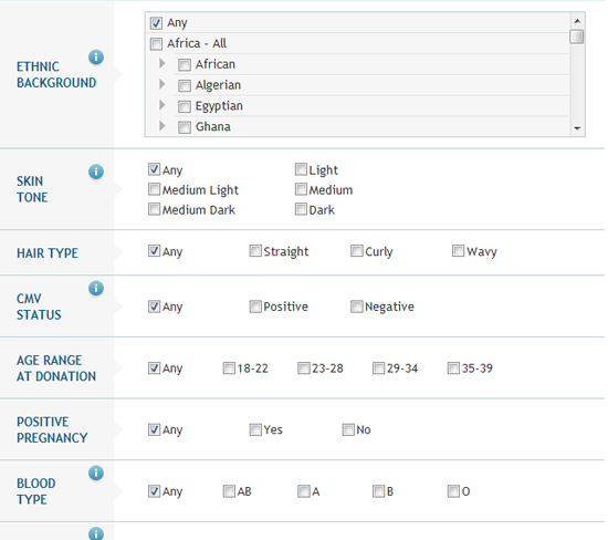 这里会有一些条件,如捐助者类别、种族、头发颜色、眼睛颜色、教育程度、捐赠年龄范围等等。