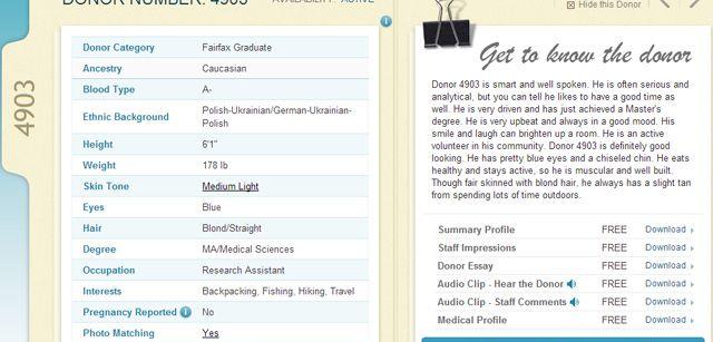如果有意购买精子的客户,需要先登录费尔法克斯精子库的网站,然后在检索项内输入献精者的种族、血型、眼睛和头发颜色、身高、教育程度等,检索出符合她个人特定条件的捐精者。