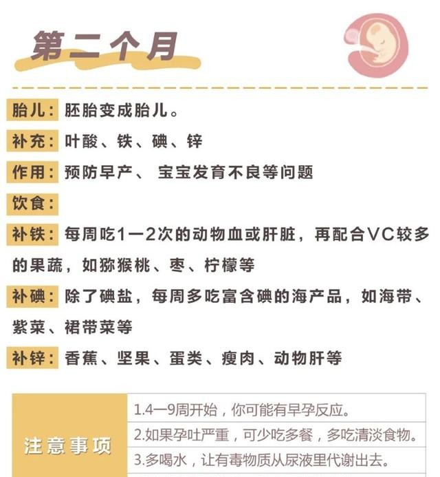 第一个月重点要补充叶酸。第二个月