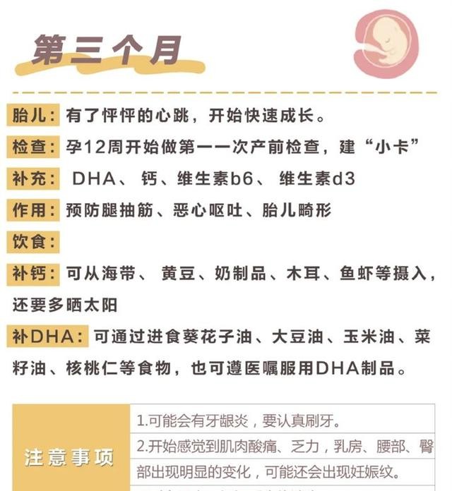 第三个月去做B超就能听见胎心了,这个时候就要医院建档了可以买一本孕妇文件夹,用来装产检报告和单据。开始补充DHA、钙、维生素;(具体时间根据医嘱)当你感觉肚子痒,长红点,就是长妊娠纹的征兆,可以开始涂护肤油第四个月