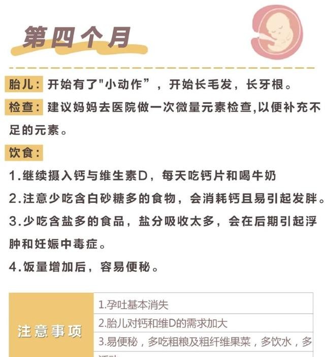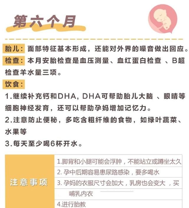 开始补充DHA、钙、维生素;(具体时间根据医嘱)当你感觉肚子痒,长红点,就是长妊娠纹的征兆,可以开始涂护肤油第五个月