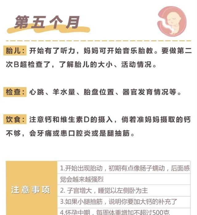 第五个月开始如果脚抽筋就要问下医生要不要多补充点钙剂。还要控制体重,避免妊娠糖尿病等并发症。