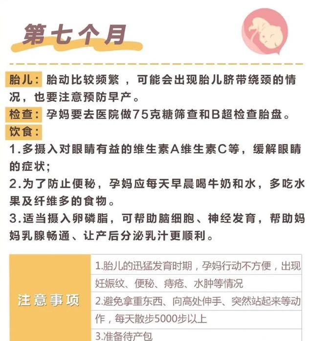 第七个月开始就正式进入孕晚期了,还是要多注意胎动频率,如有异常,务必马上去医院。