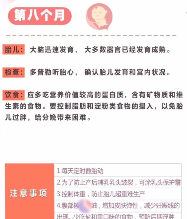 第八个月是胎儿快速增加体重,这个阶段会压迫到腹腔,孕妈会出现气喘和尿频。这都是正常的。
