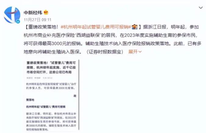 媒体报道,杭州市商业补充医疗保险西湖益联保近日新增了辅助生育相关项目,包括胚胎培养和胚胎移植两项试管婴儿项目,每年最高可报销3000元。