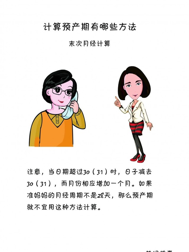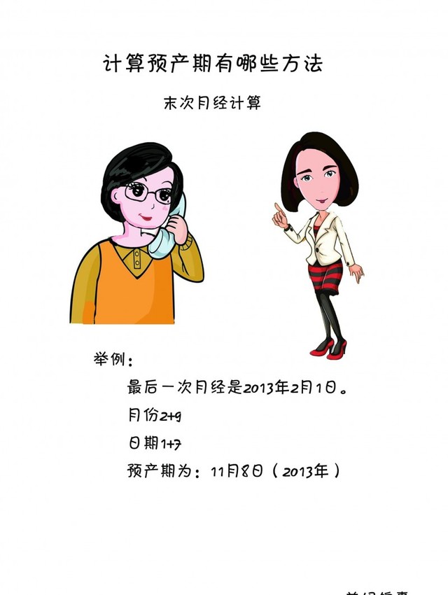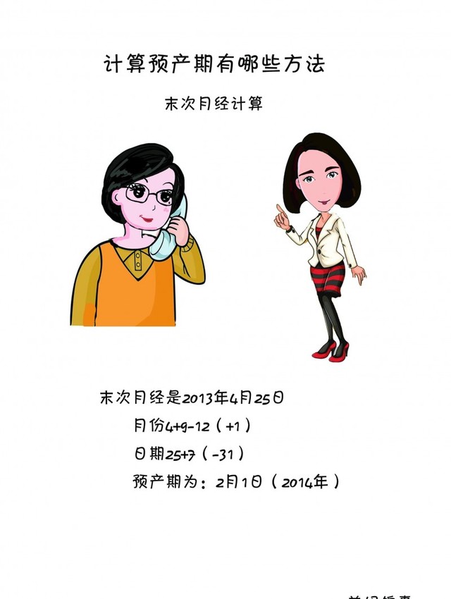 第一种,末次月经计算, 预产期从末次月经的第一天开始计算,为9个自然月再加上7天(40周)。注意,当日期超过30(31)时,日子减去30(31),而月份相应增加一个月。如果准妈妈的月经周期不是28天,那么预产期就不宜用这种方法计算。 举例: 最后一次月经是2013年2月1日。 月份2+9 日期1+7 预产期为:11月8日(2013年) 末次月经是2013年4月25日 月份4+9-12(+1) 日期25+7(-31) 预产期为:2月1日(2014年)