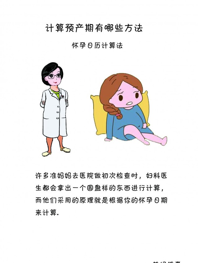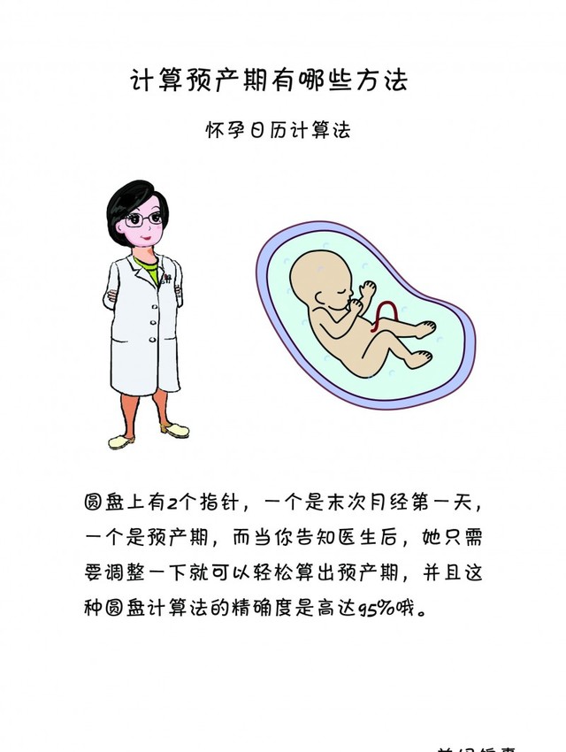 第二种, 怀孕日历计算法 ,许多准妈妈去医院做初次检查时,妇科医生都会拿出一个圆盘样的东西进行计算,而他们采用的原理就是根据你的怀孕日期来计算,圆盘上有2个指针,一个是末次月经第一天,一个是预产期,而当你告知医生后,她只需要调整一下就可以轻松算出预产期,并且这种圆盘计算法的精确度是高达95%哦。