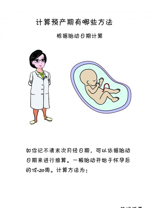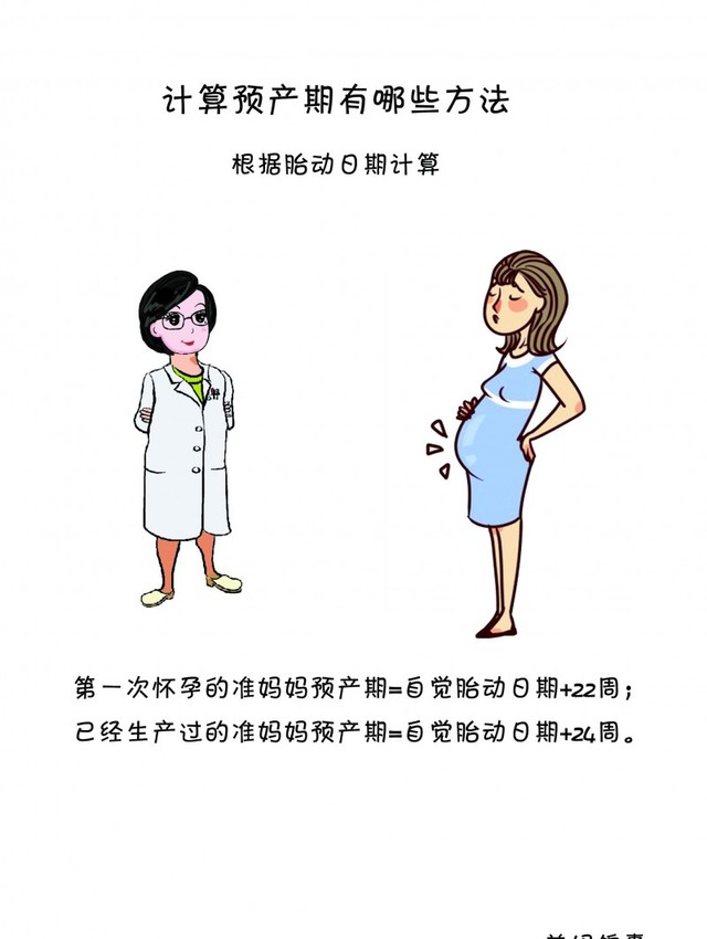 第三种,根据胎动日期计算 ,如果准妈妈记不清末次月经日期,可以依据胎动日期来进行推算。一般胎动开始于怀孕后的18-20周。计算方法为: 第一次怀孕的准妈妈预产期=自觉胎动日期+22周; 已经生产过的准妈妈预产期=自觉胎动日期+24周。