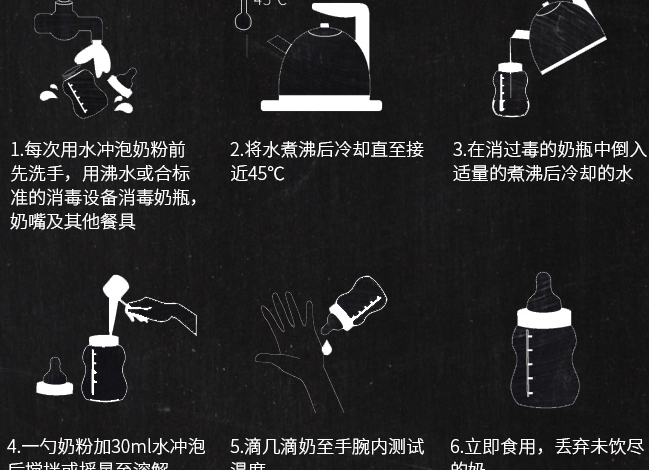 1、每次用水冲泡奶粉前先洗手,用沸水或者合标准的消毒设备消毒奶瓶、奶嘴及其他餐具;