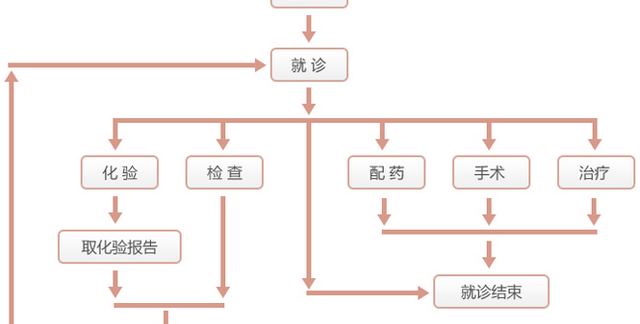 就诊一共有9个步骤:预约挂号→取号/挂号→就诊→缴费→检验检查→取报告→再次就诊→取药→治疗。