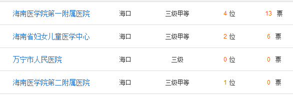 省市 医院 地址 海南 海南医学院第一附属医院 海南省海口市龙华区龙华路31号 海南 海南和京生殖医院 海南省海口市龙华区海秀中路119号 海南 海南医学院第二附属医院 海南省海口市龙华区椰海大道368号 海南 海口玛丽医院 海南省海口市美兰区蓝天路7号 海南 海南省妇幼保健院 海南省海口市琼山区龙昆南路15号 海南 海南现代妇女儿童医院 海南省海口市琼山区琼州大道18-1号 海南 琼海市中医院 海南省琼海市嘉积镇跃华路 海南 文昌市人民医院 海南省文昌市文城镇
