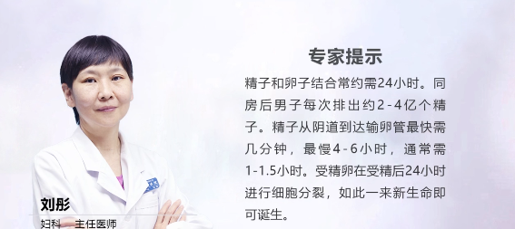 精子和卵子结合前,精子会从阴道跑到输卵管,期间最快的几分钟,最慢4-6小时,一般1-1.5小时。精子在宫腔及输卵管能时够获能,然后穿透卵细胞的放射冠及透明带与卵子表面结合形成受精卵。受精卵在受精后24小时进行细胞分裂,这样一个新生命就诞生了。