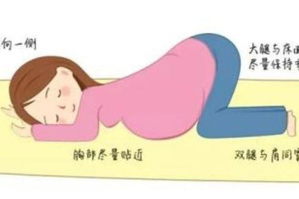 方法:孕妈妈身心放轻松,跪在铺有软物的硬板床上,头贴床上,侧向一方,双手前臂伸直置于头的两侧,胸部尽量与床贴紧,臀部抬高,大腿与小腿成直角。