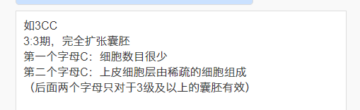 囊胚3cc中“3”代表的是不同扩张期囊胚,这里指的是已经处于完全扩张的囊胚,然后“c”和“c”主要是对内细胞团和滋养层细胞进行质量分级。