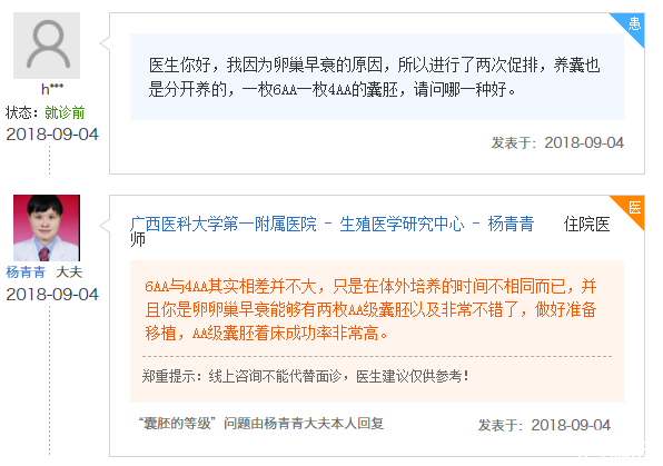 之前做过一次试管婴儿,第一次移植6aa囊胚失败了,而带来好孕的这次同样是也是移植的6aa囊胚,做好的移植前的准备,医生也没有要求打针和服用药物,也验出了好孕。案例2