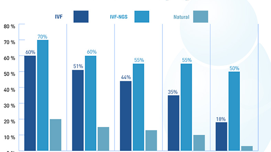 从年龄来看,在染色体筛选的帮助下,该院成功率最高的是试管婴儿+下一代基因测序IVF-NGS, 随后是体外受精(无染色体筛选),而自然受孕治疗位于第三位,成功率不超过20%。