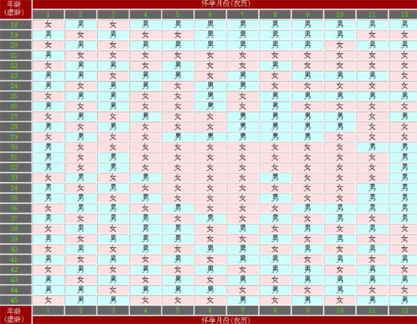 若遇到闰月,闰月可以根据清宫表算生男生女,在表格的左边,找到自己的年龄,然后看表格上面找到自己怀孕时的月份,年龄和月份的交点,就是所要查找的生男生女的结果了,具体可查看下图表:
