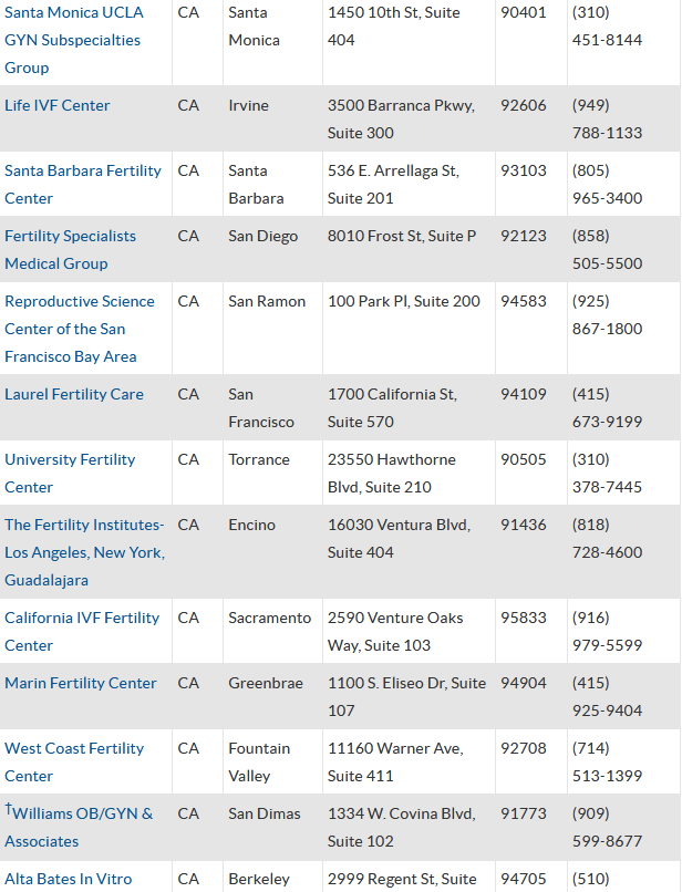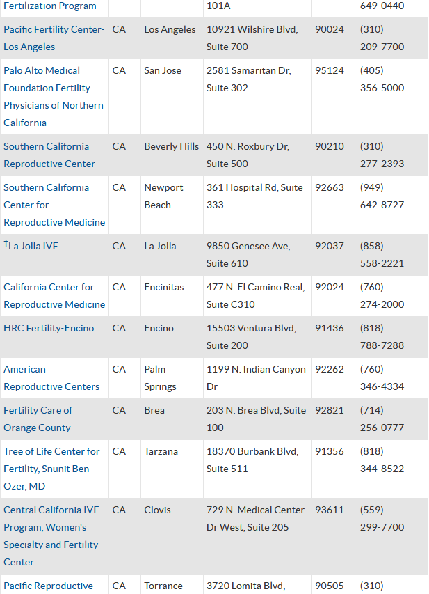 在加州这79家诊所中也有不少大家在国内耳熟能详的,比如旧金山湾区生殖科学中心、太平洋生育中心、La Jolla IVF、CCRM、SCRC、FSAC等等,同时这里还设立有美国比较知名的精子库之一,加州精子银行Cryobank(CCB)。