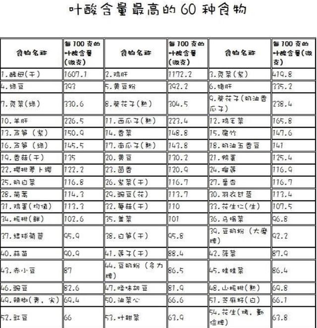 为大家总结出一些叶酸含量高的食物表,希望能够对各位准妈妈有所帮助。