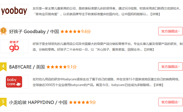 排名 品牌 优势 Top1 好孩子 中国规模最大的儿童用品集团之一 Top2 芙儿优ForU 集研发设计生产销售策划服务于一体 Top3 小龙哈彼 全球领先的大型儿童用品提供商 Top4 小天使Angel 曾获中国名牌,婴儿床十大品牌 Top5 宜家IKEA 全球最大的家居用品零售商之一 Top6 小硕士saoors 儿童用品设计/制造和销售的重要企业之一 Top7 黄色小鸭 从事儿童用品设计、制造和销售的重要企业之一 Top8 GRACO葛莱 全球知名的婴幼儿产品品牌 Top9 爱斯博儿Espoir 大型婴童家具制造商,婴儿床行业领先企业 Top10 英氏Yehoo 知名高端婴童用品品牌
