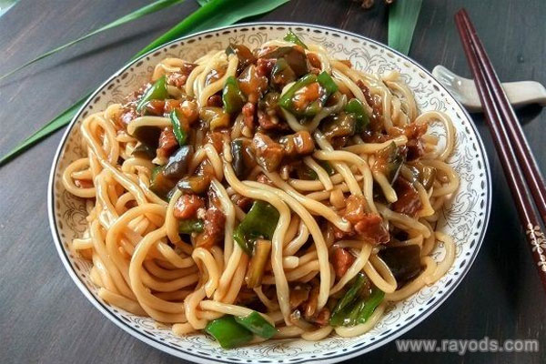 第二步:水烧开放入面条煮熟捞出,起锅烧油将茄子炸软,顺便便将青椒过油捞出;