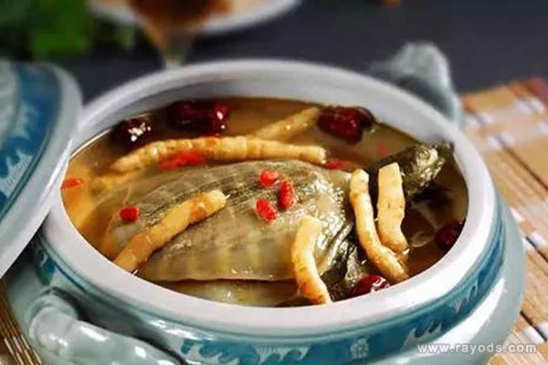 做法:甲鱼1只(约500克),冬虫草(可用蛹虫草代替)10克,红枣20克,调料适量。共同隔水炖2小时后,调味食肉喝汤。