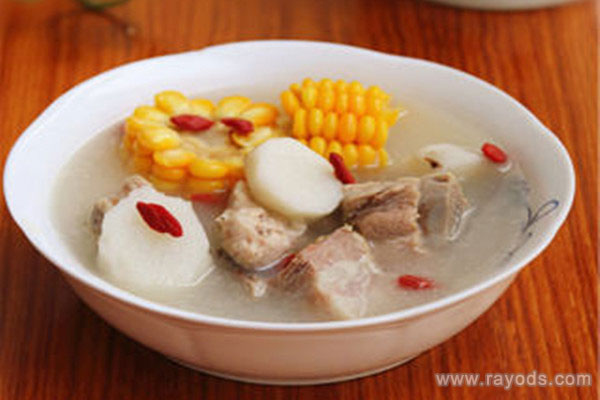 材料:猪脊骨、山药、嫩玉米、桂皮、生姜、香叶、枸杞、精盐各适量。