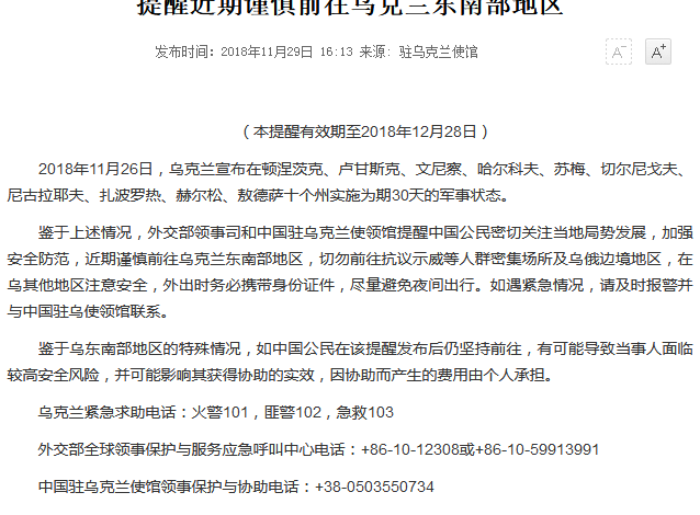 近期谨慎前往乌克兰·***外交部[引用日期2018-11-29]