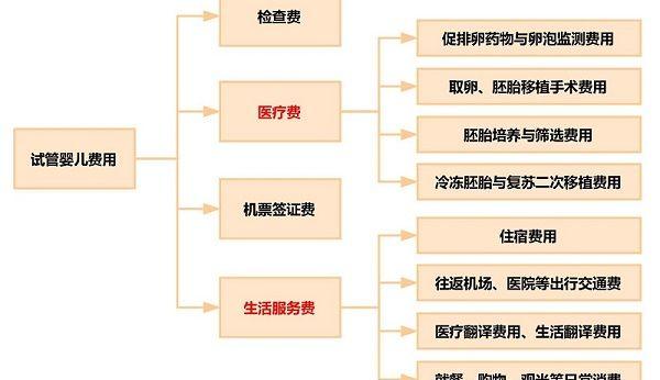 药物费用,如促排卵使用的药物,因为进口药和国产药的不同会导致费用差别很大,但是一般在5000-15000元左右; 试管婴儿手术及实验室操作费用,这部分会受到患者年龄、病因等制定不同的治疗方法,因而产生的费用也是不同的,一般大约在2万元左右,总的花费在2万多至3万元不等。试管婴儿的费用视具体情况而定,一个试管婴儿手术的典型费用(一代试管婴儿技术)为3万人民币左右。每家医院每个地区可能收费标准不一样,造成的试管婴儿费用也有所差异。