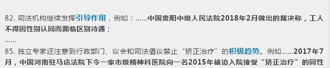 正是在这一背景下,中国国内围绕多元性别议题展开的两例影响性诉讼,谦逊地走出了国门,作为“诉诸司法”实践中的有效国家措施,悄然进入了独立专家的报告中。