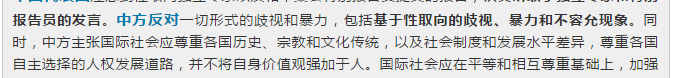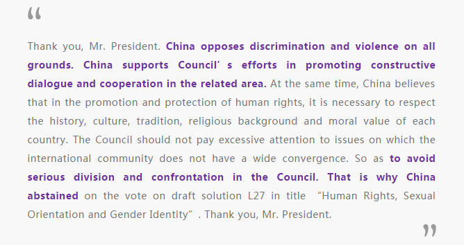 值得注意的是,中国并未像一些国家一样,将承诺局限在独立专家强烈呼吁的“反歧视、反暴力”框架内,而是多迈出了宝贵的一步,将反对基于性取向的不容允(intolerance)现象一并纳入了立场陈述中。