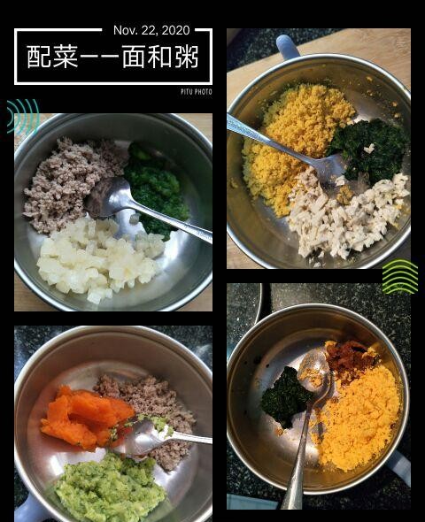辅食是:碎碎面+肉末+根茎类或菌类菜和叶菜+核桃油+芝麻海苔粉或芝麻猪肝粉